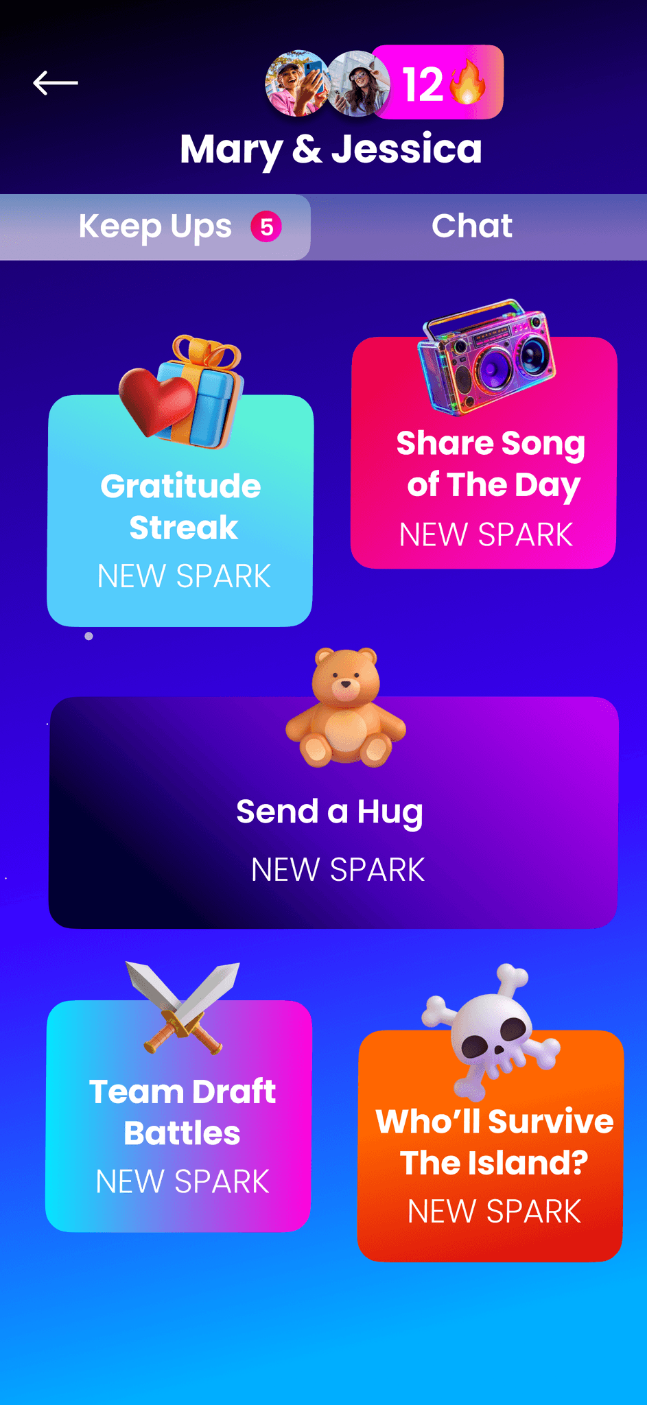 Every day, your group gets a fun drop of sparks. A question, challenge, or mini-game that everyone answers together.